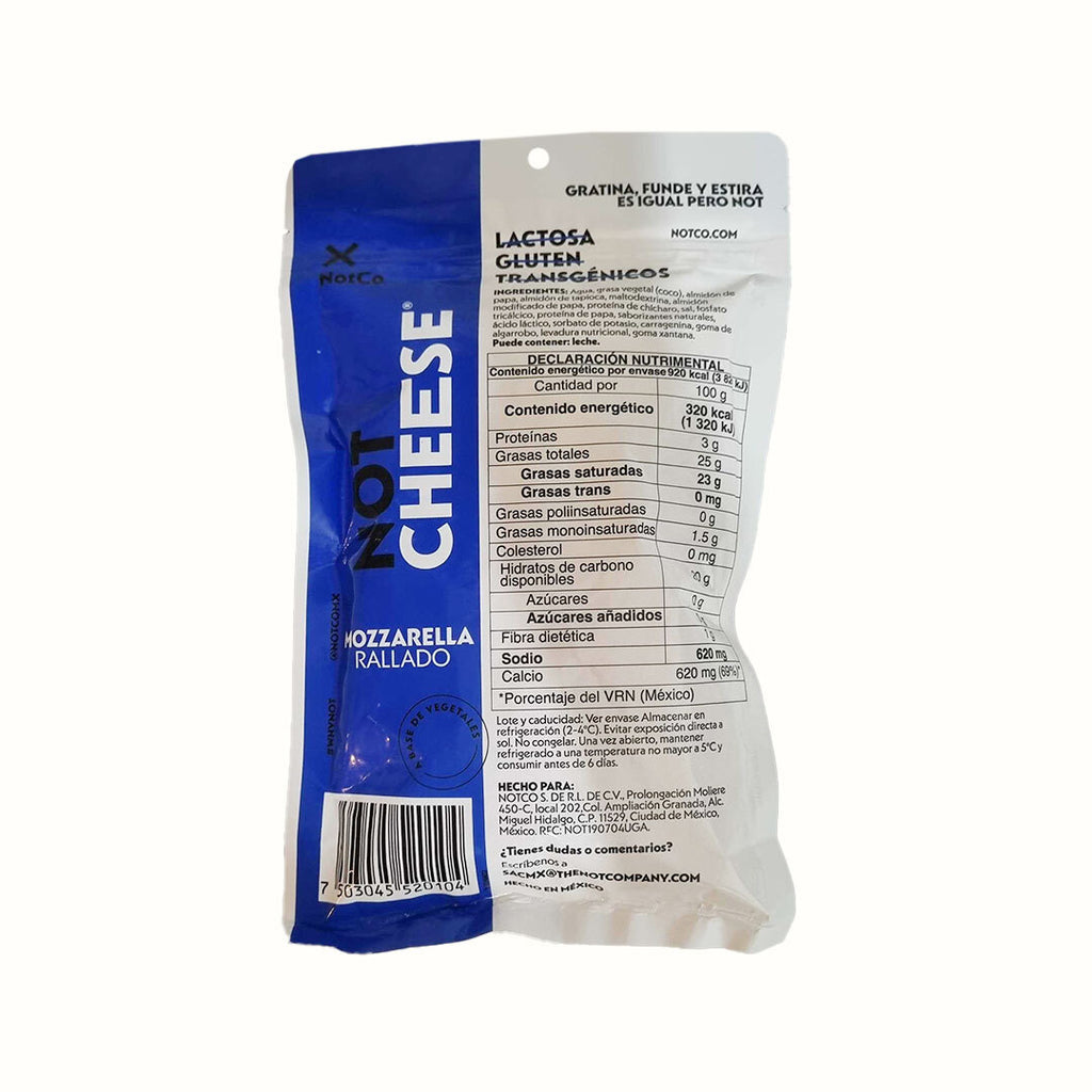 Ingredientes: Agua, grasa vegetal (coco), almidón de papa, almidon de tapioca, maltodextrina, almidón modificado de papa, proteína de chícharo, sal, fosfato tricálcico, proteína de papa, saborizantes naturales, ácido láctico, sorbato de potasio, carragenina, goma de algarrobo, levadura nutricional, goma xantana.